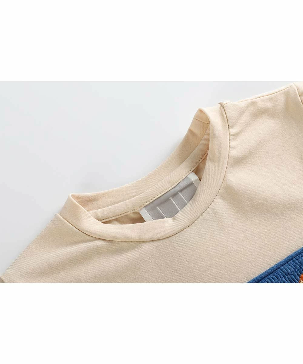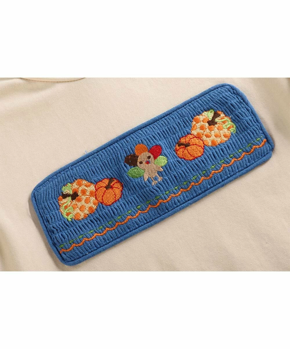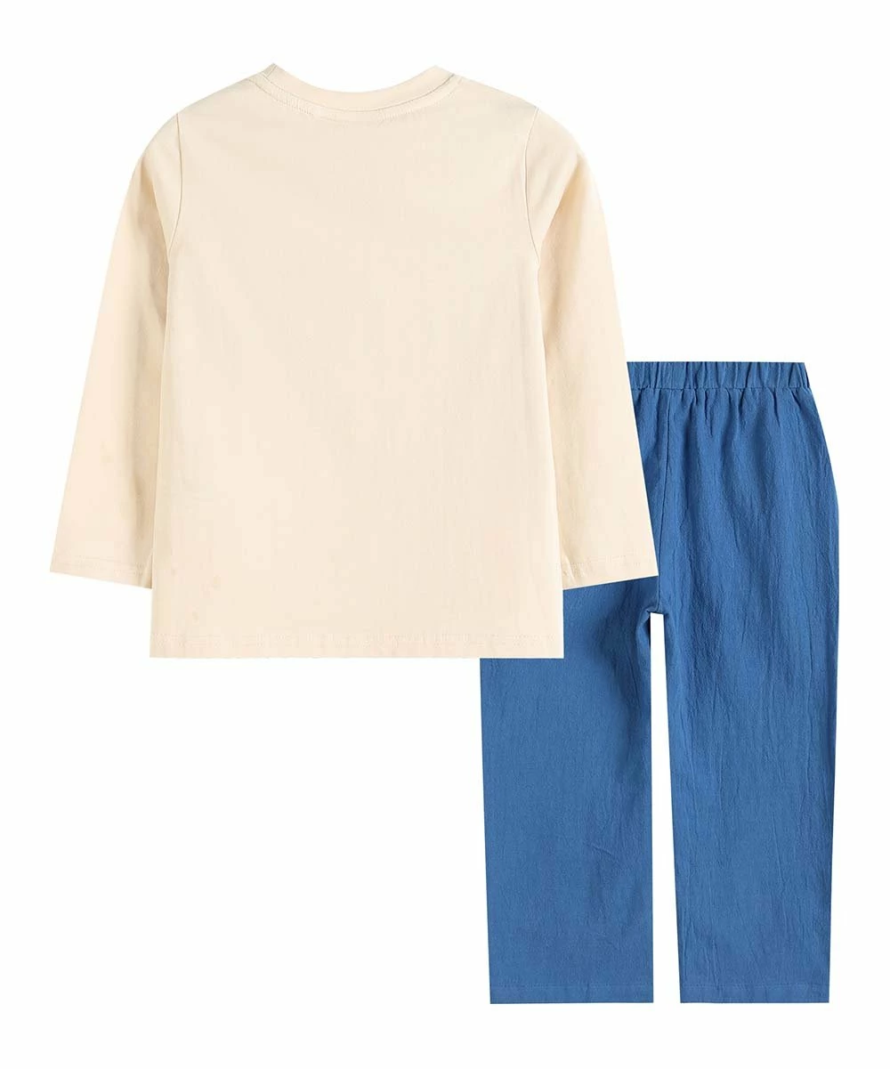 - Includes beige long-sleeve tee and blue pants (two pieces total)