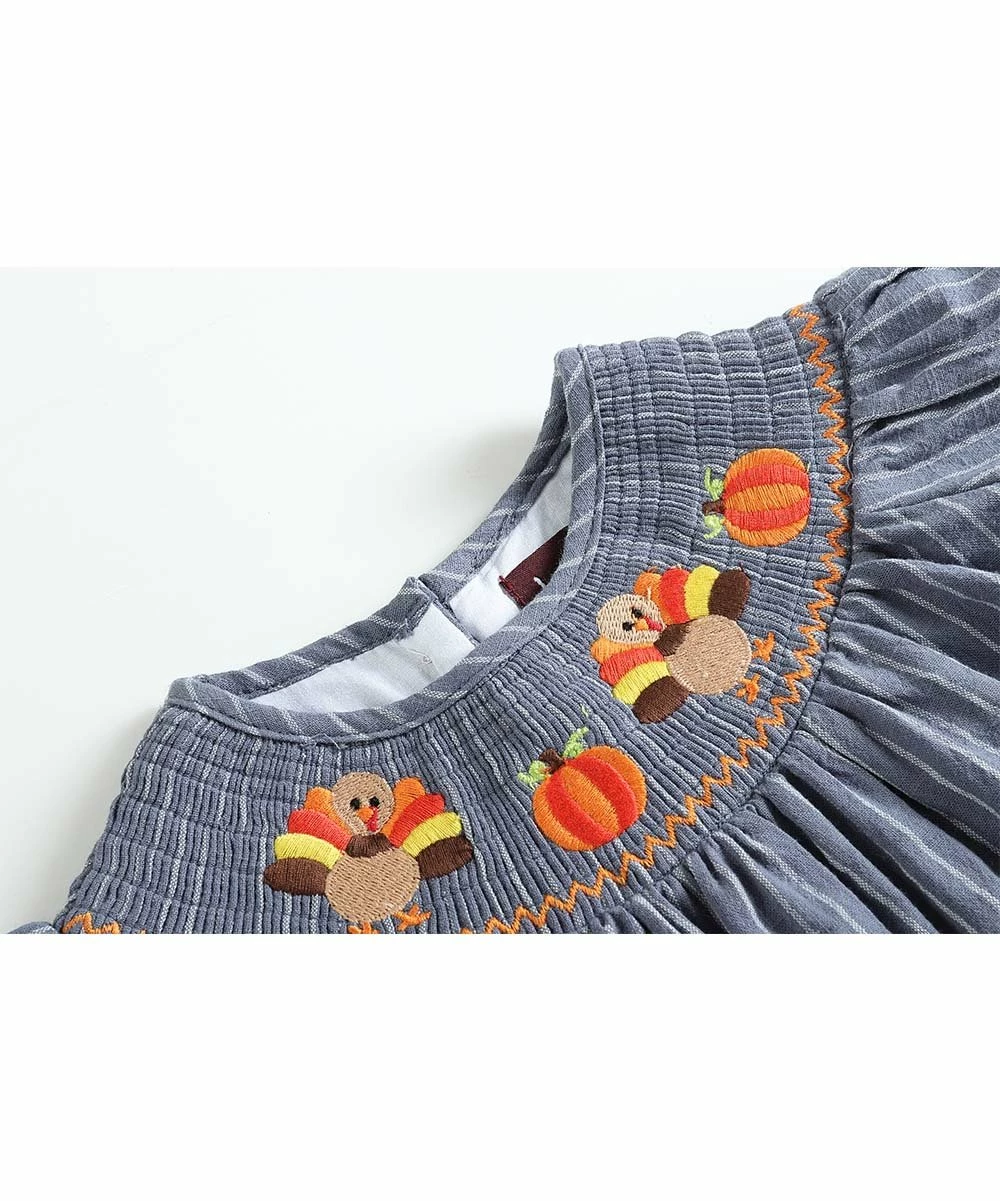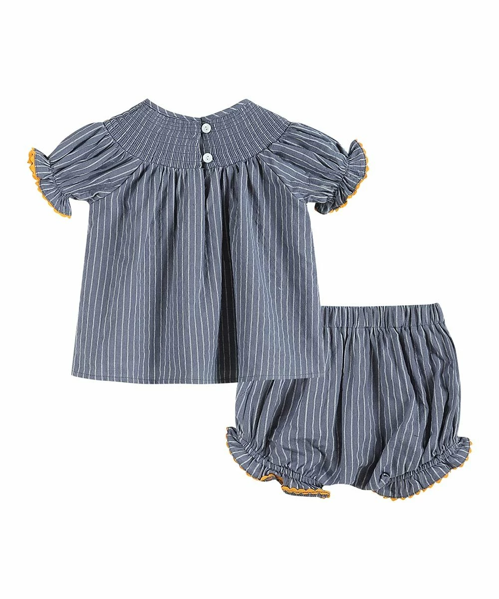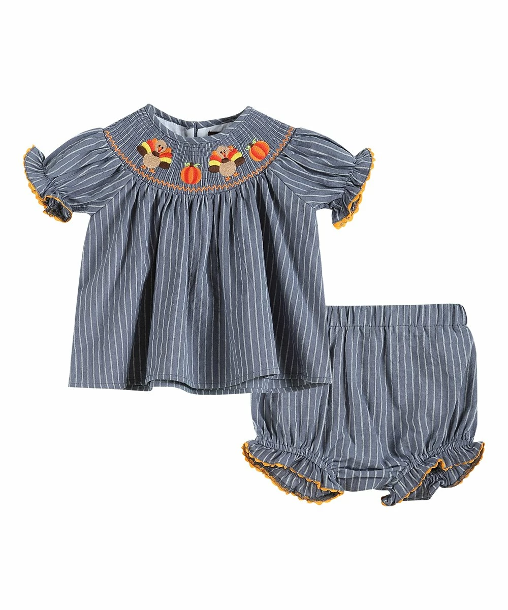 - Includes blue stripe turkey smocked top and matching bloomers (two pieces total)