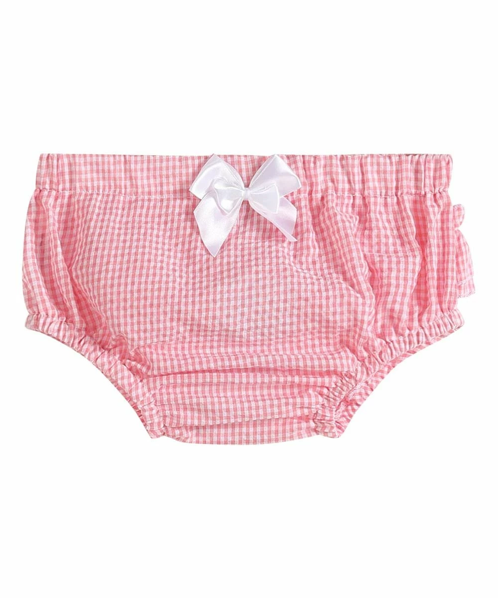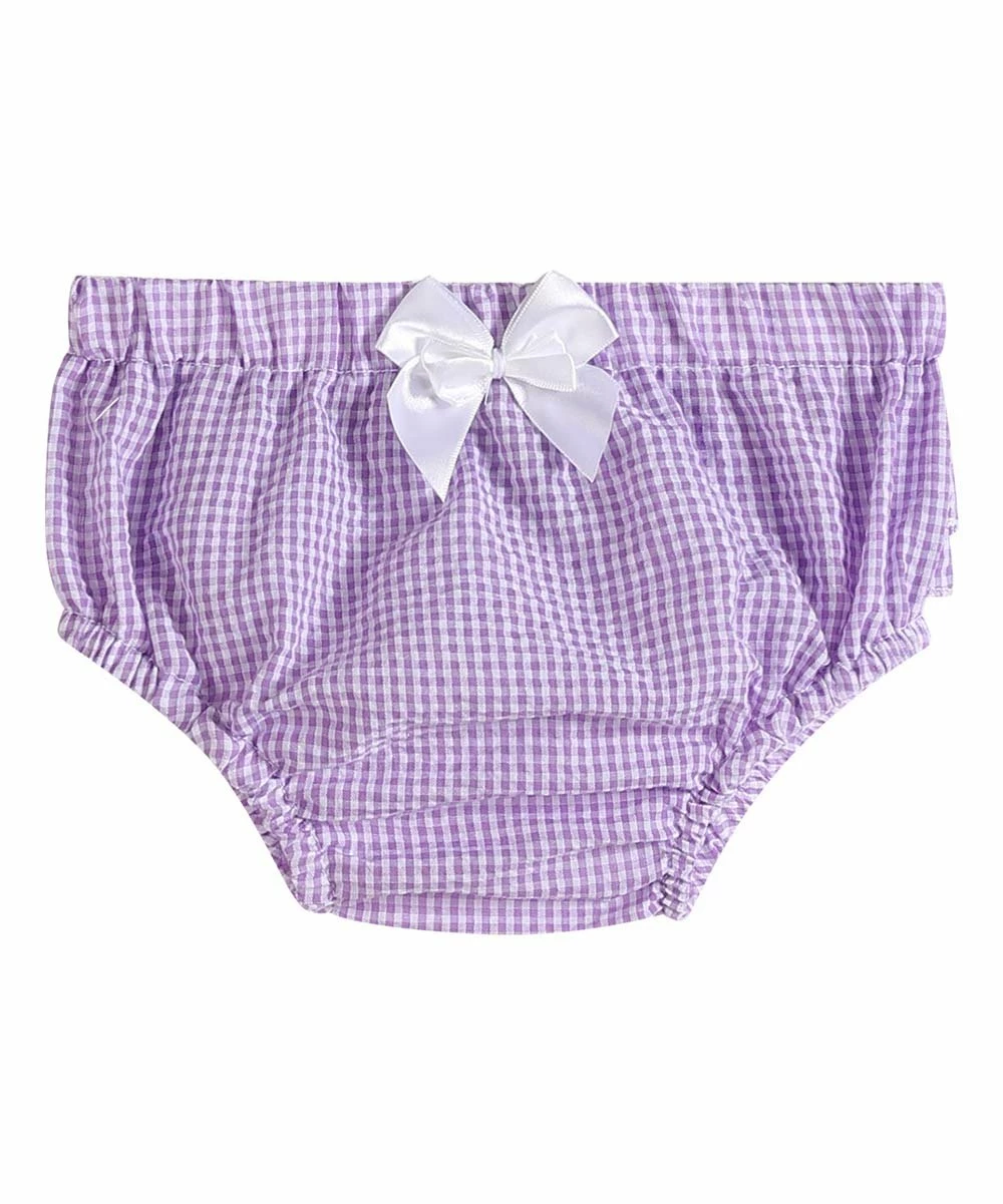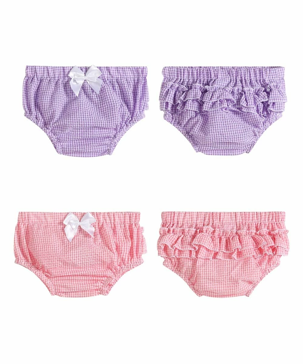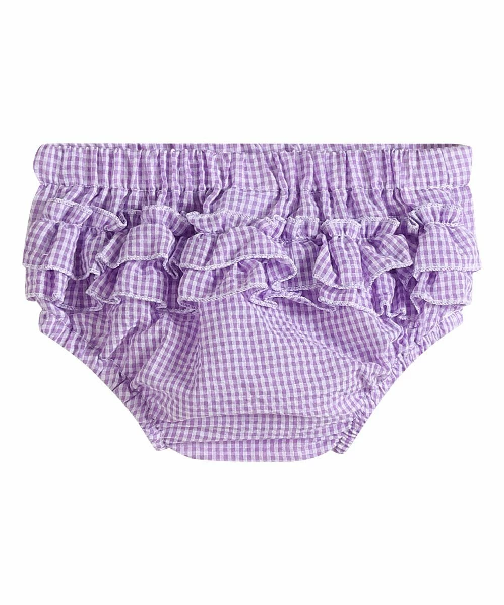 - Includes a pair of light pink gingham ruffle bloomers and a pair of purple gingham ruffle bloomers (two pieces total)