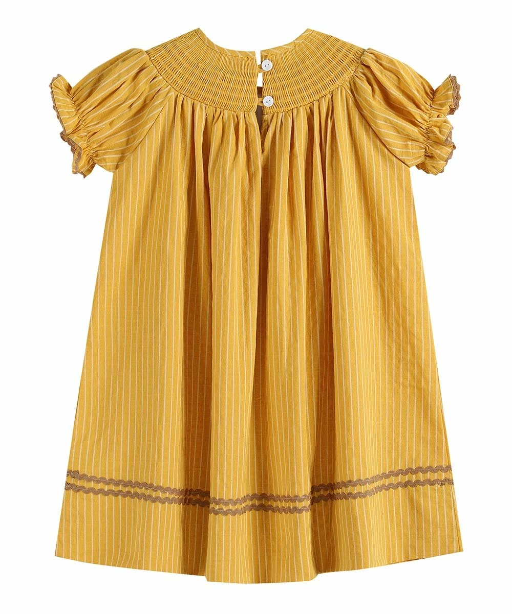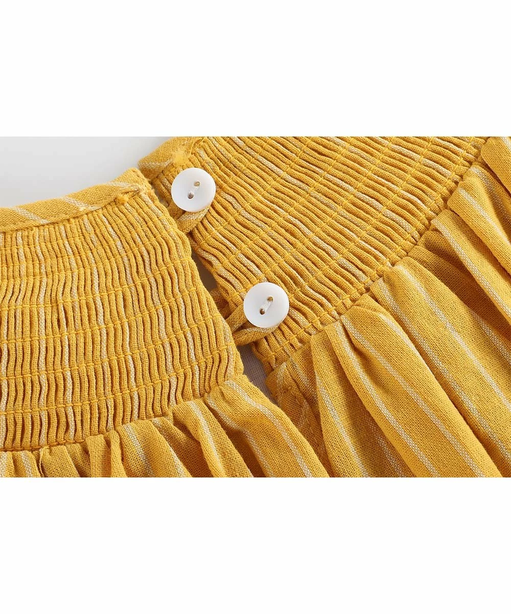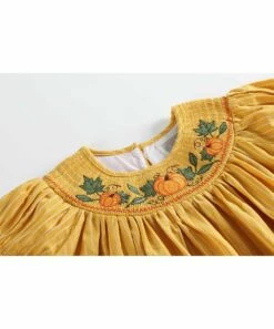 This flowing dress has puff sleeves and an embroidered yoke.