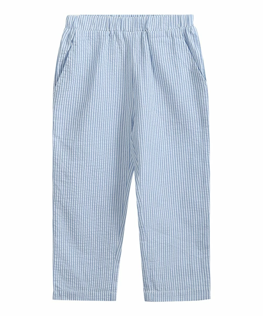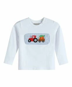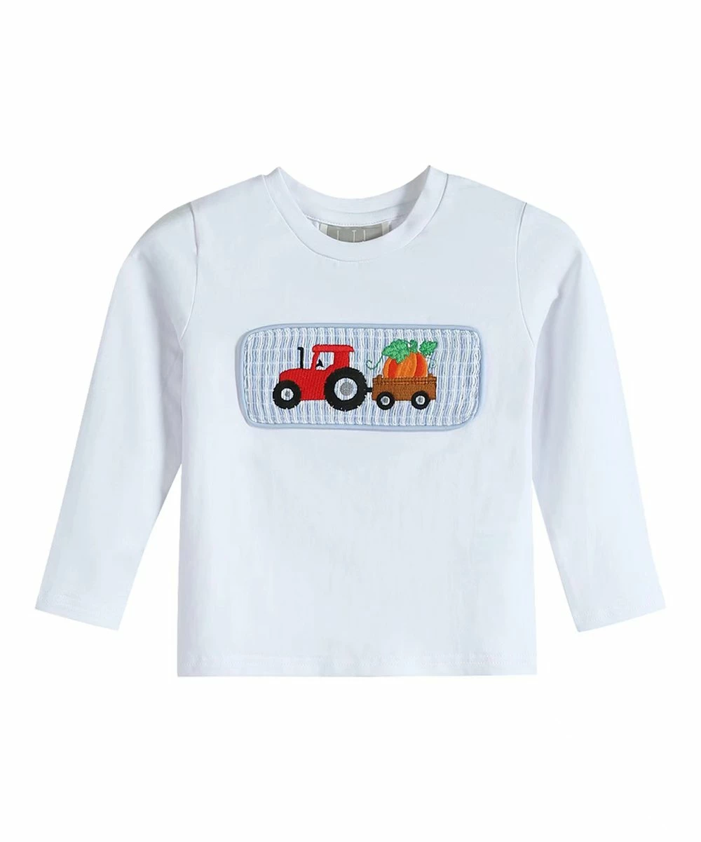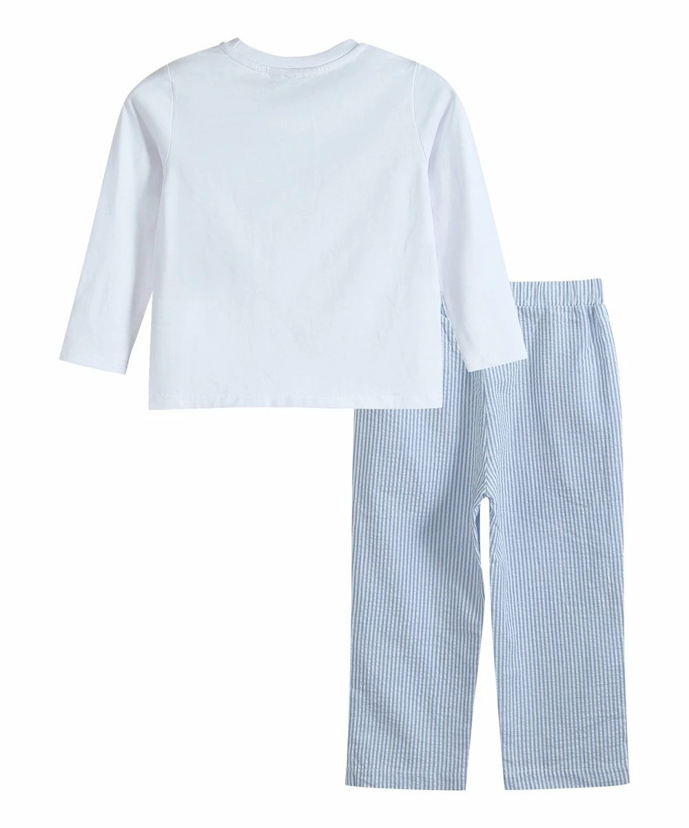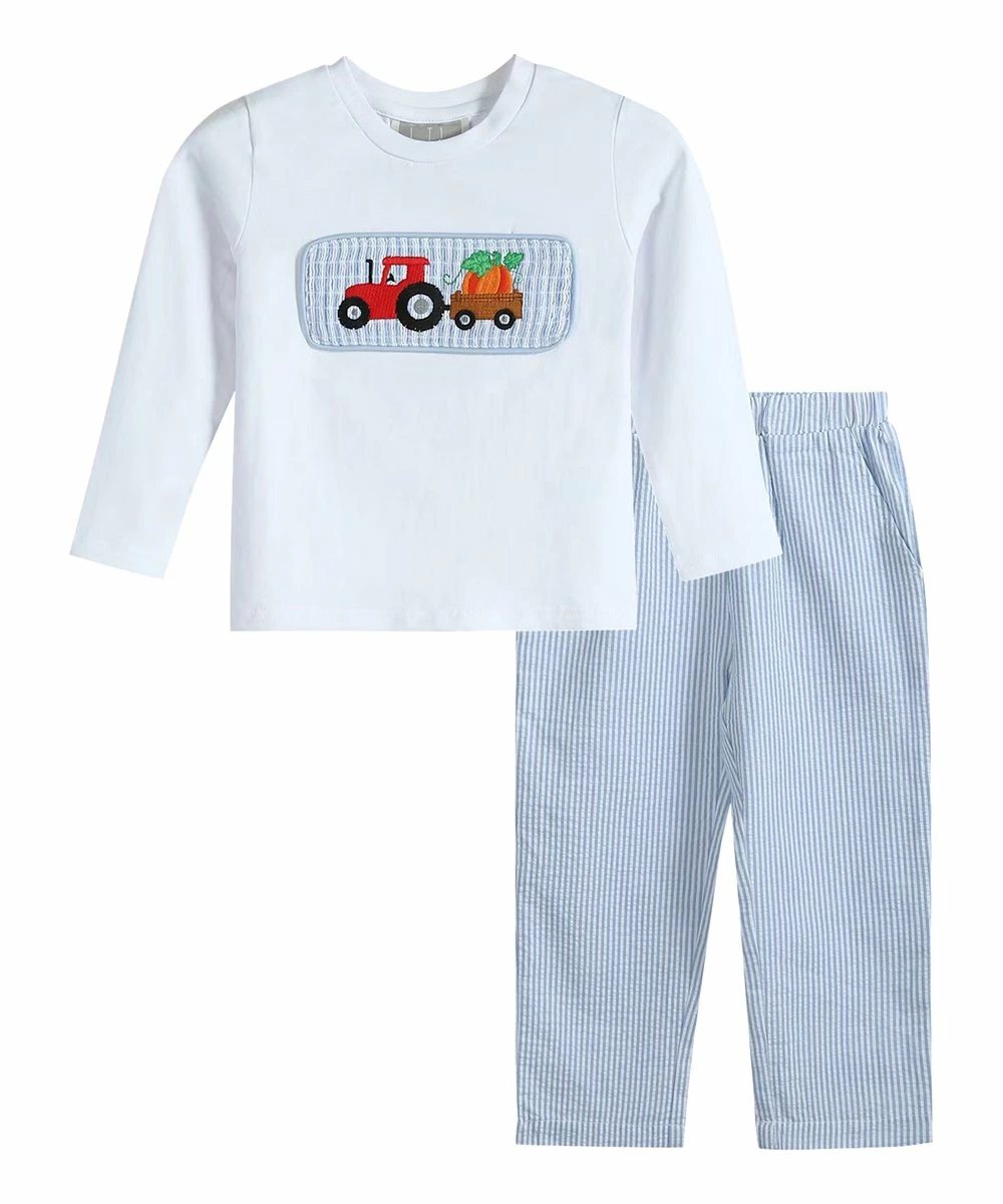 - Includes one white tractor pumpkin top and one pair of light blue seersucker pants (two pieces total)