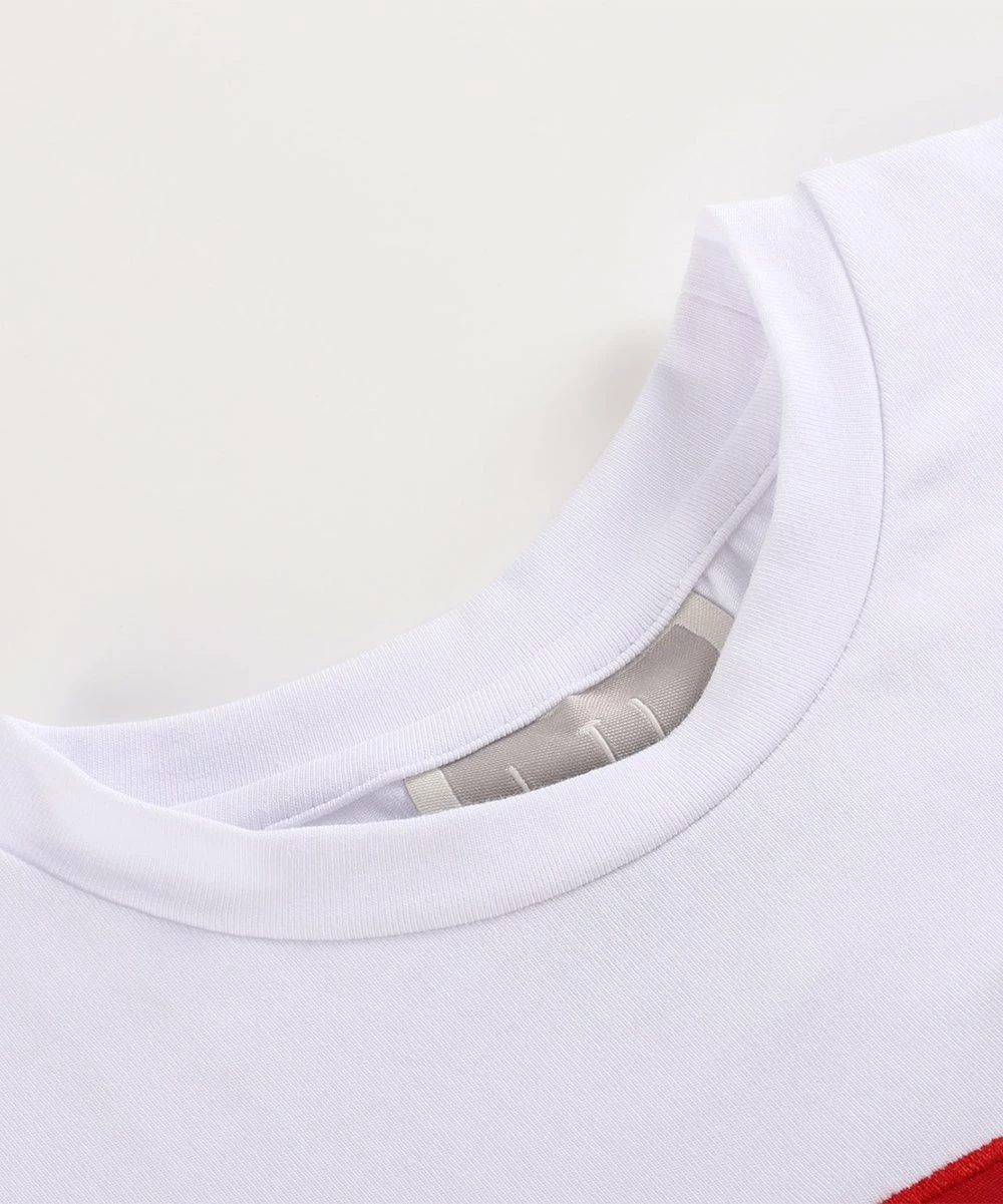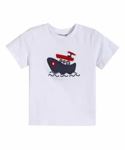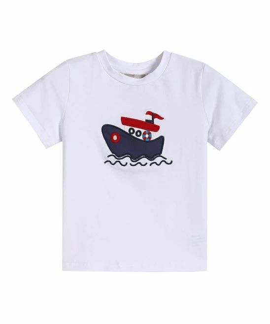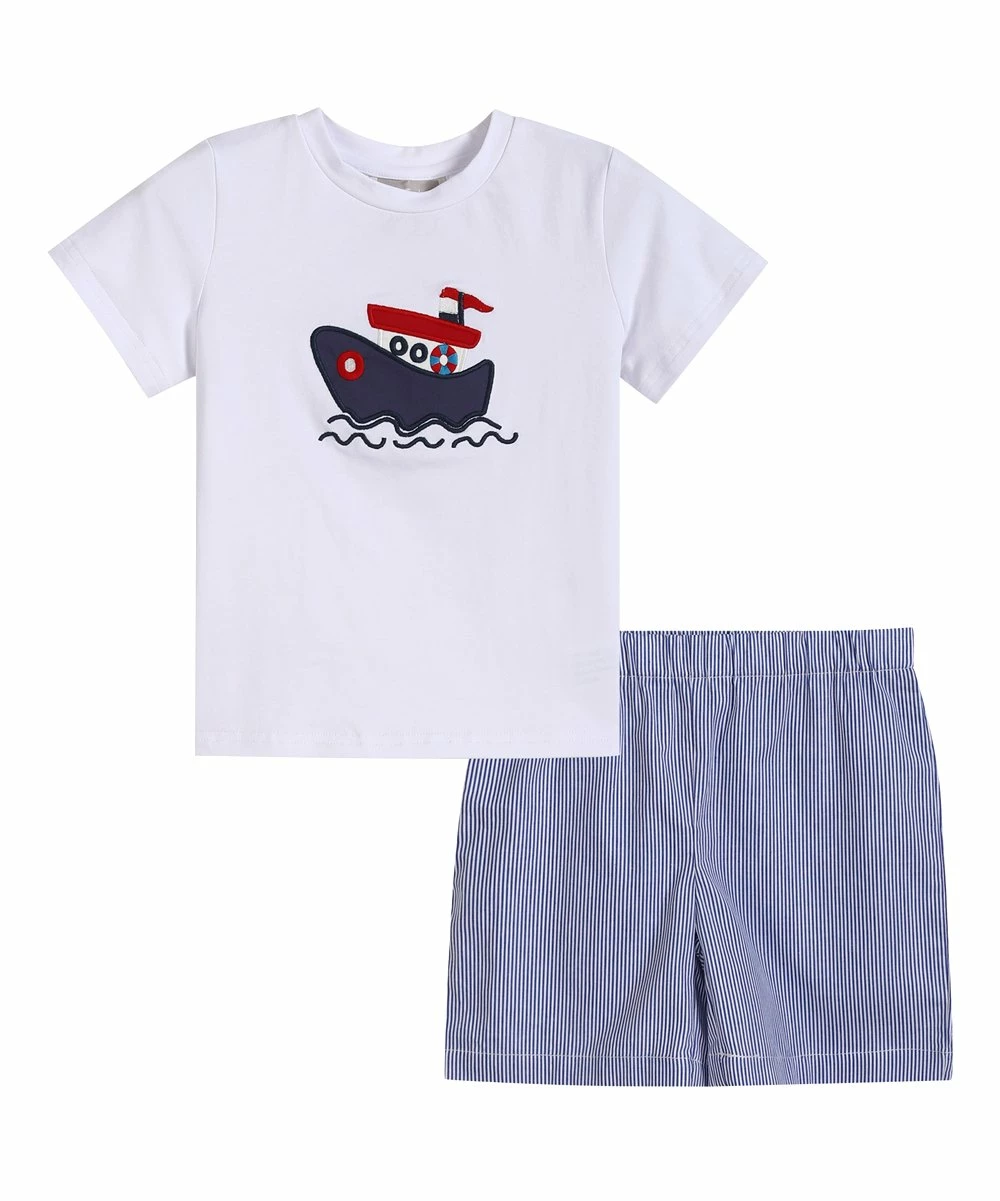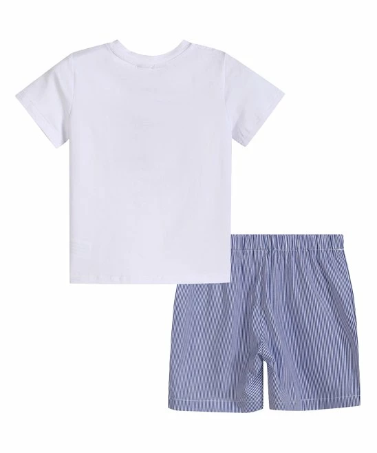 - Includes a white tugboat tee and blue stripe shorts (two pieces total)